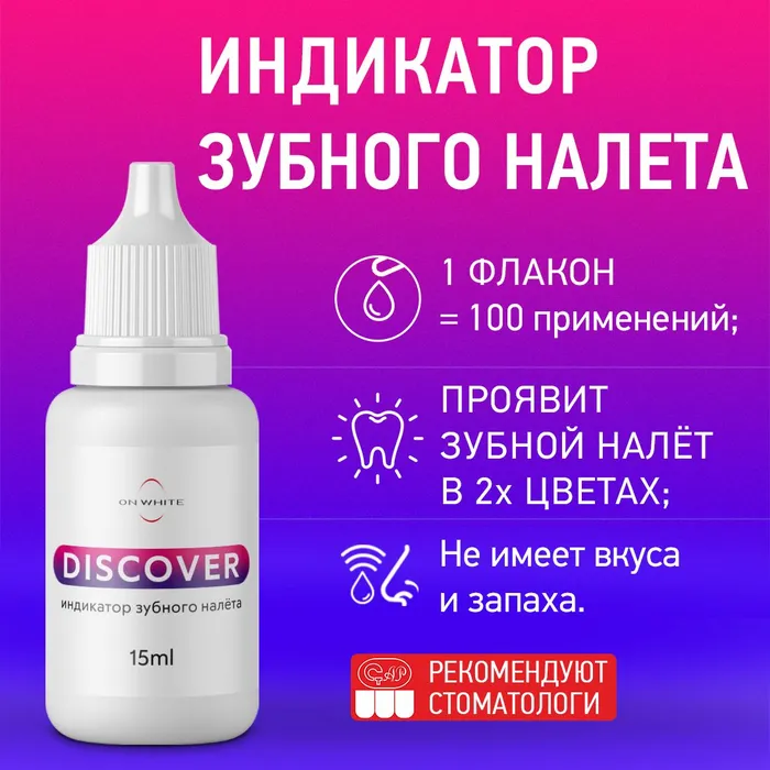 Задумались над тем, насколько тщательно вы чистите зубы? Справляется ли ваша зубная щетка со своей задачей? Хотите понять не пора ли вам сделать профессиональную чистку зубов? Можно легко и просто получить ответы на эти вопросы. Всё, что вам понадобится – это ватная палочка и наша новинка Индикатор зубного налета. 1. Нанесите индикатор на ватную палочку. 2. Промокните поверхность зубов. Благодаря тому, что это концентрат моментального действия, всего через десять секунд вы будете точно знать расположение налета и то, как долго он находится на ваших зубах. Старый окрасится в фиолетовый цвет, а свежий приобретет розовый оттенок. Одного флакона вам запросто хватит на 100 применений. Особенно такой длительный и тщательный контроль важен для тех, кто носит брекеты. С помощью индикатора зубного налета вы сможете приучить своего ребёнка тщательно чистить зубы. Индикатор не имеет вкуса и запаха, не содержит каких-либо подсластителей или фруктовых отдушек, а значит ваш малыш будет избавлен от желания (и риска) проглотить средство, не раздражает мягкие ткани полости рта, а также не содержит эритрозин, который, при попадании в организм, может негативно сказаться на функциях щитовидной железы, печени и сердца